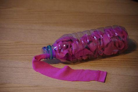 Get a long strip of fabric and stuff it into a plastic bottle. Leave the end sticking out. Then put some dry food or treats inside the bottle and shake it up so it gets mixed into the fabric. Make sure to remove any loose plastic rings from the bottle before giving it to your dog.