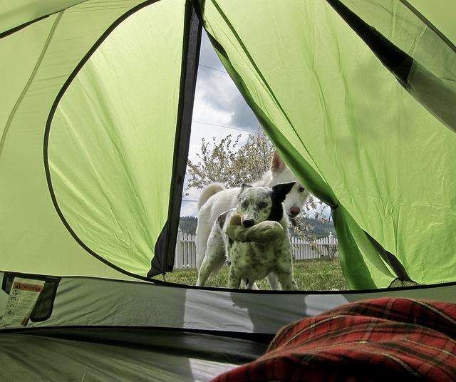 Allow your dog to sleep as close to you as possible. Ideally you should provide him with his own sleeping compartment, or place his basket in the front portion of the tent or next to you in the caravan. It's best not to let your dog sleep outside or in a separate tent, as this may make him stressed and insecure. It also increases the risk of your beloved pet being stolen. So that your dog can become accustomed to sleeping in a tent, set it up at home and treat him to a fun trial holiday before you leave!